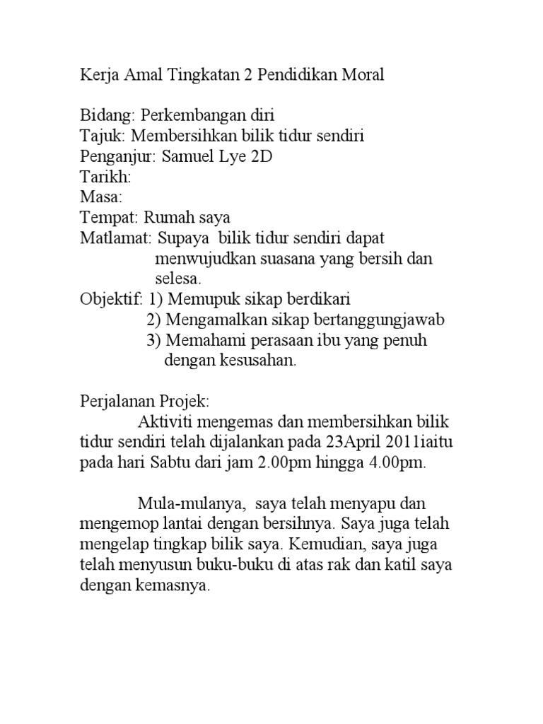 Kerja Amal Moral Perkembangan Diri. Cadangan kerja amal Bidang Perkembangan Diri pelajar hanya perlu jalankan 1 aktiviti sahaja Pelajar boleh buat kerja amal ini di mana-mana sahaja yang berkenaan Nilai kerajinan. 33105847 kerja amal pendidikan moral bidang perkembangan diri tajuk membantu menjaga anak jiran penganjur ng chi san pelajar matlamat mewujudkan course hero.