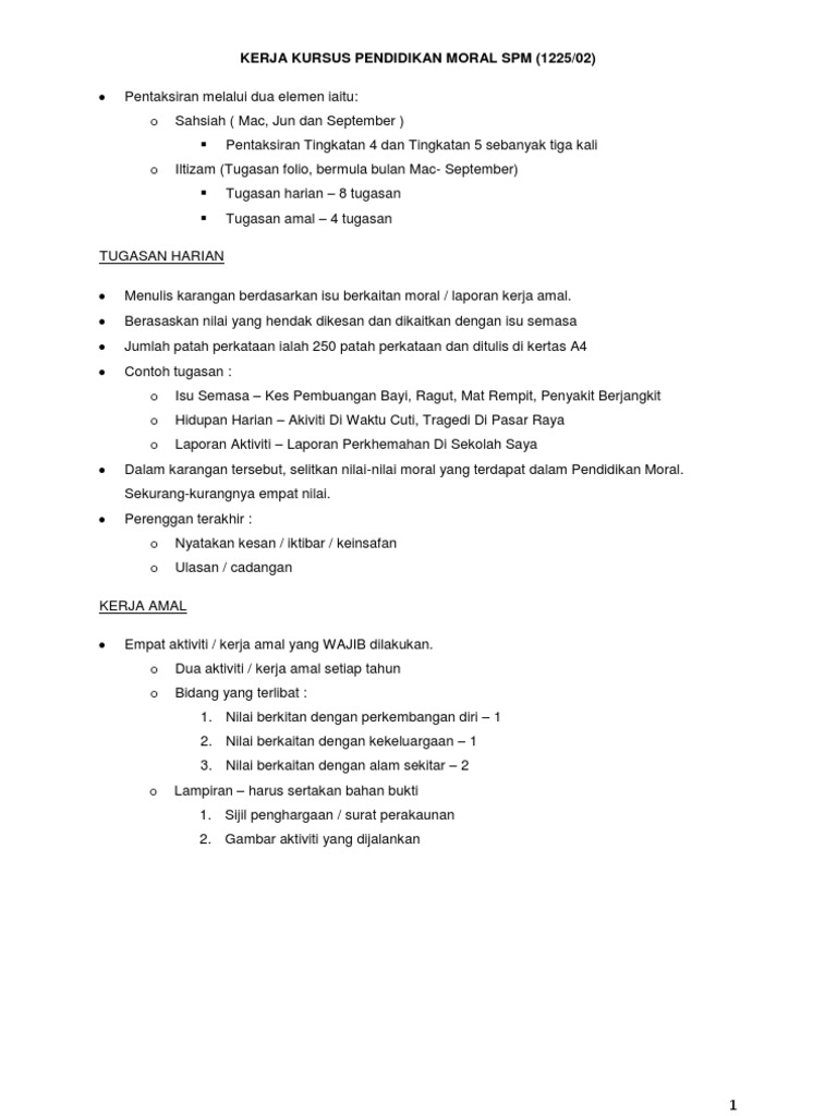 Calon dikehandaki melibatkan diri dalam empat aktiviti Kerja Amal yang berkaitan dengan tiga bidang pembelajaran Pendidikan Moral iaitu. Kerja Amal Pendidikan Moral Bidang. Moral Folio SPM - Tugasan Esei.
